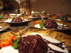 Dark Chocolate Walnut Torte with Roasted Pear, Espresso Crème Anglaise and Florentine Cookie